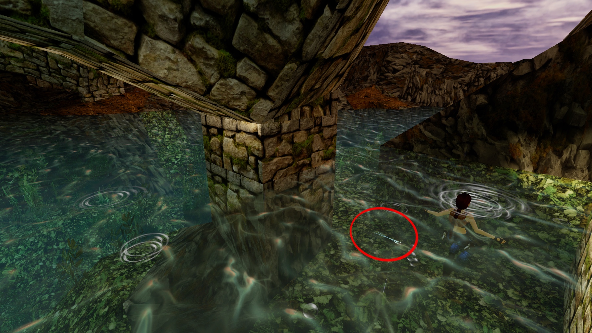 Springt von der Harpune aus mit einem Kopfsprung geradeaus ins Wasser. Schwimmt mit der Springen-Taste nahe der Oberfläche geradeaus, auf die Uzis zu und haltet dabei die Aktionstaste gedrückt. Mit etwas Glück flutscht Lara aus dem Wasser auf die Plattform mit den Uzis.