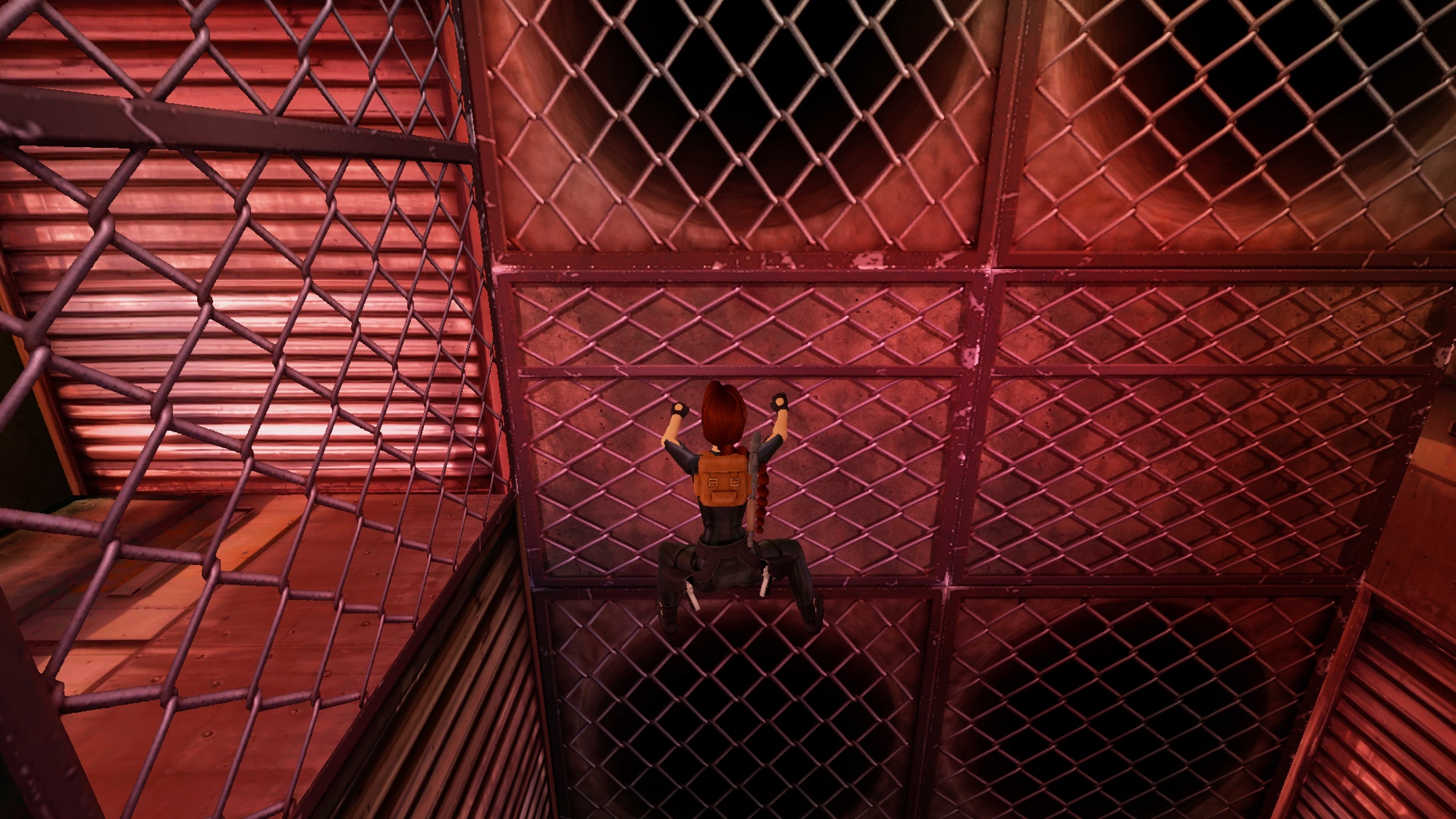 Klettert hier über dem Stacheldraht nach links hinüber und weiter hoch, bis zu der Stelle wo links ein Gitter mit einem roten Licht dahinter ist. Klettert bis zu der Stelle hoch wo Laras Hände die Schiene im Klettergitter berühren. [Screenshot] Führt hier einen Salto nach hinten mit Drehung in der Luft aus. (Drückt dafür Sprung und sofort die Rolle-Taste.)