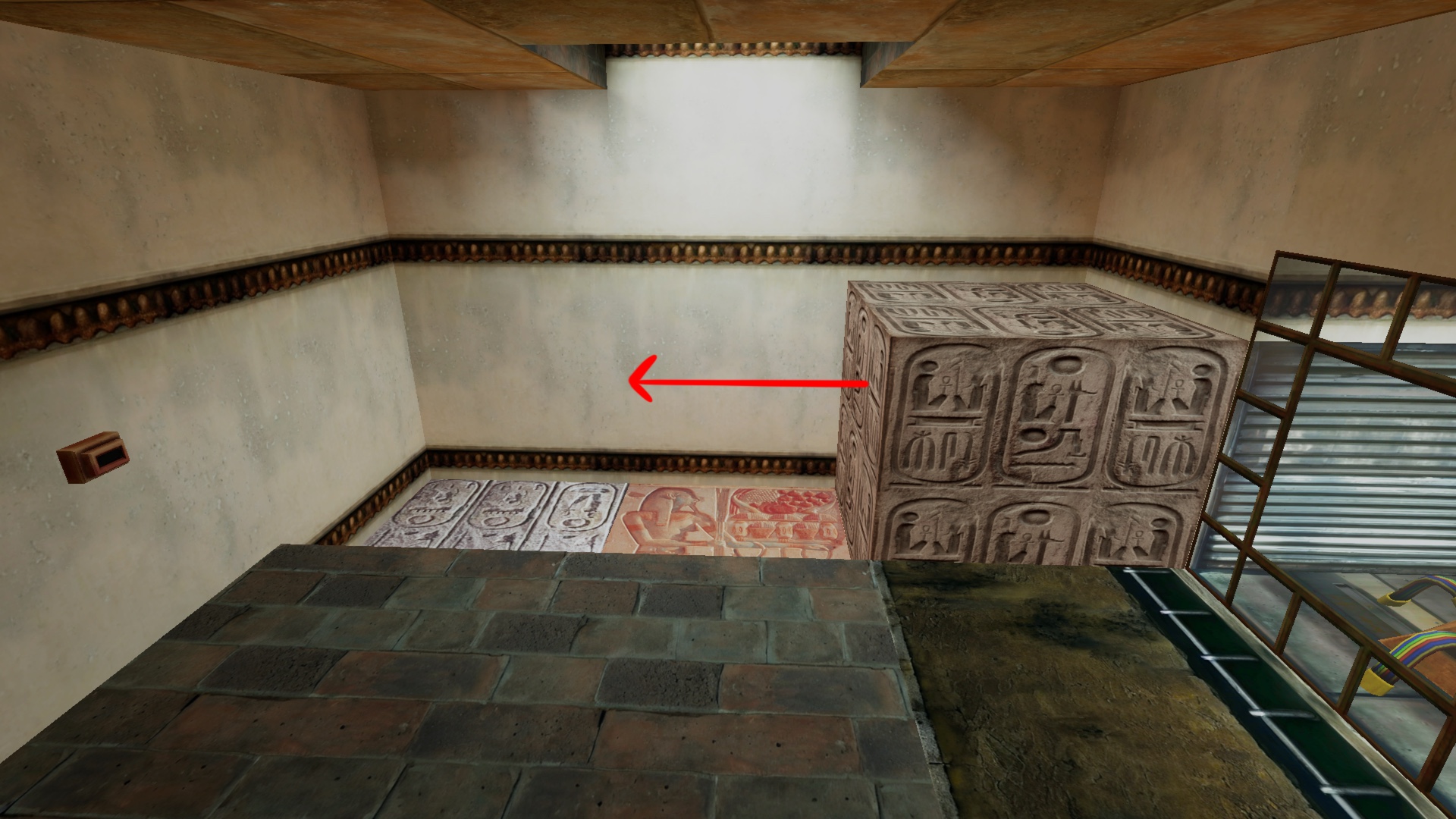 Zieht und schiebt diesen nach links auf die graue Bodenplatte, auf der ebenfalls Hieroglyphen abgebildet sind. Dadurch wird eine Steinsäule, die die Tür zum Ausstellungsraum blockiert hat, verschoben.