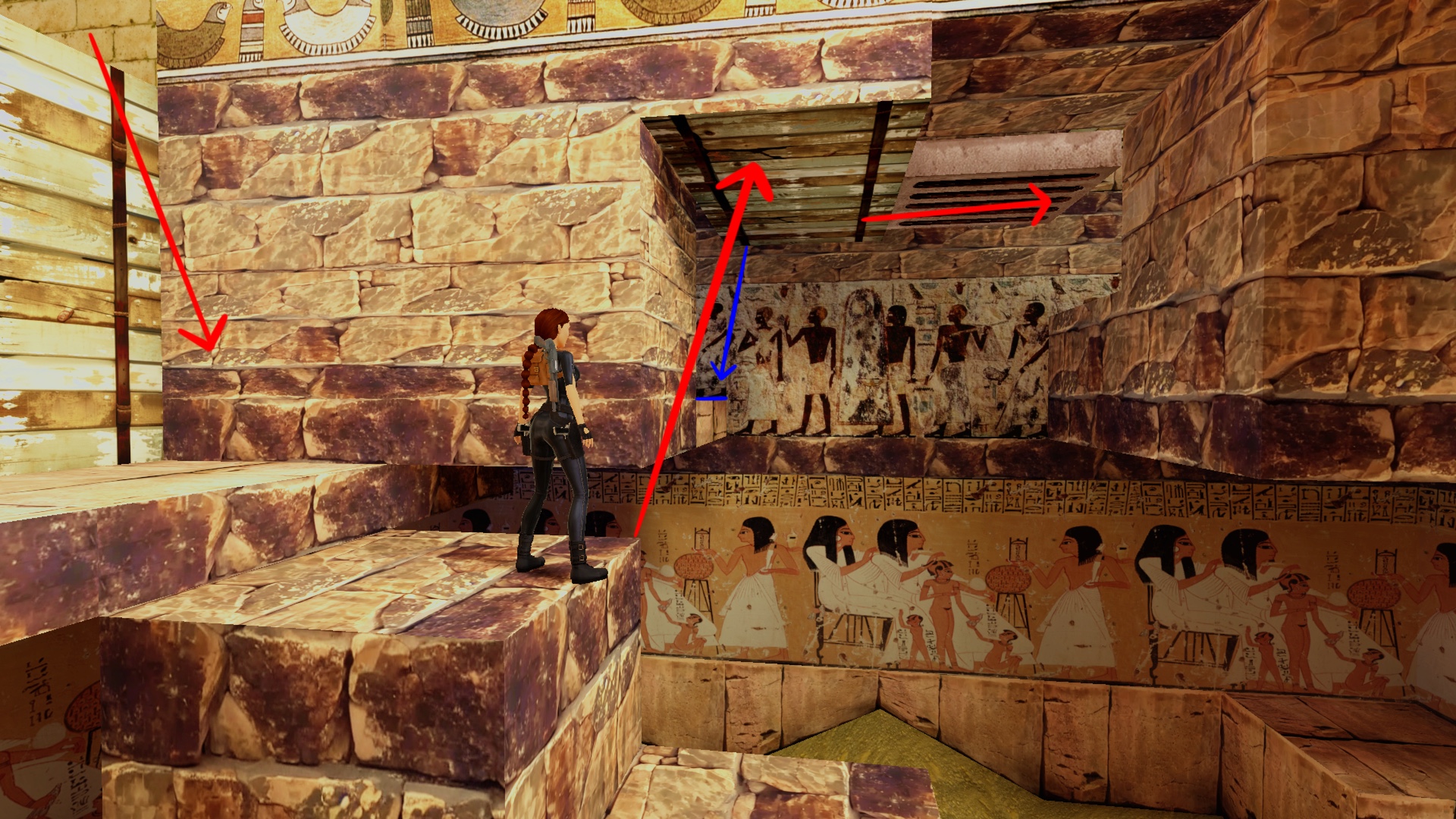 Klettert dann in der Mitte des Ganges, mit Blick an die hintere Wand, in die Öffnung hinauf. Klettert dort nach rechts in die Nische. Dreht euch dann um, schaut hinaus und nach links und springt mit Anlauf zu der Nische dort. Lara springt über eine Schräge hinweg und landet wieder auf der oberen Ebene. Klettert nach rechts hinein und betätigt dort den Druckschalter, um eine Falltür links von euch zu öffnen. Klettert dann auf den Block in der Nische links. Klettert das Gitter hinauf und durch die geöffnete Falltür. Verlasst das Gitter dort mit einem Rückwärtssalto.