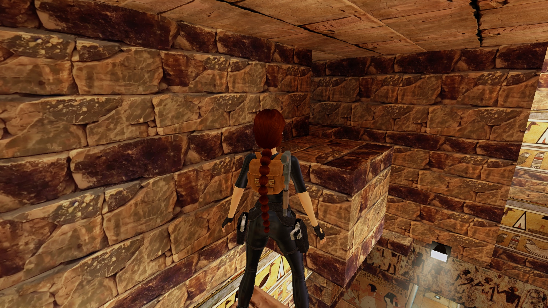 Geht nach links und stellt euch dort etwa in der Mitte des linken Blocks an die vordere Kante, schaut zum Kristall rechts hinüber und dreht die Kamera nun schrittweise nach links, bis Lara zu den Säulen schaut und die Kamera herum schwenkt. Führt nun einen Rückwärtssalto aus. Lara sollte auf dem Kopfschmuck der Sphinx landen und dort hinab rutschen. Greift nach der Kante. Fällt Lara daran vorbei, nimmt sie etwas Schaden. Dann ist zwar nicht alles verloren und ihr könnt über Umwege und einen weiteren Cornerbug doch noch wieder nach oben gelangen, aber dies werde ich hier nicht beschreiben. Ladet also in diesem Fall.
