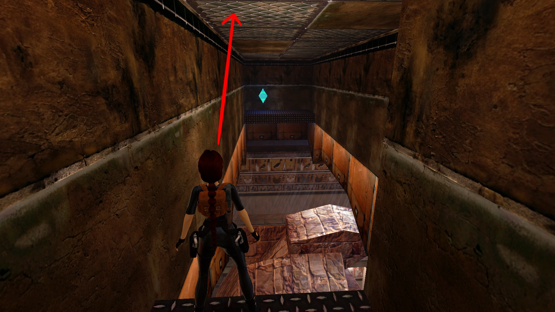Greift nach dem Klettergitter hinter euch. Klettert dieses hinauf und zieht euch in den Kriechspalt. (Dabei sollte man dran denken, dass in der originalen Version die Füße baumeln müssen, wenn man hinein klettern möchte. Dies ist in der Remastered-Version nicht so.) Sammelt hier die Rakete4/59 ein. Klettert dann rückwärts wieder hinaus und ans Gitter. Klettert hier ein wenig hinab, damit sich Lara nicht den Kopf stößt. Verlasst dann die Leiter mit einem Salto und Drehung in der Luft.
